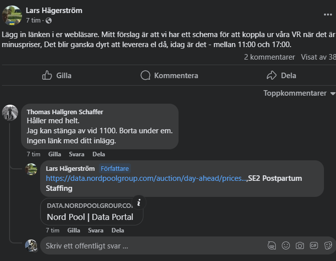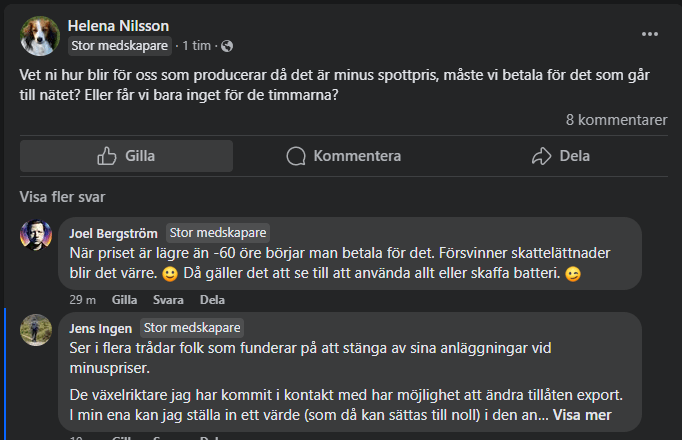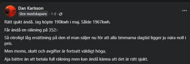 Problemet som exponeras för en sådan affärsmodell som ska agera på fria marknaden utan statliga bidrag är att sommarpriserna på el blir allt lägre och allt oftare även negativa. (Länk) För solcellsparken i Näversjön har den ekonomiska situationen försämrats kraftigt sedan den uppmärksammades i media. Jag har frågat bland annat hur de gör när det är minuspriser, fick inte svar direkt av Lars på den frågan men en kort stund efter skrev han följande i gruppen (se screenshot nedan). För att inte behöva BETALA för att ha igång solcellerna får de alltså slå av anläggningen. De måste alltså följa priserna dagligen och ha någon som ”rycker sladden” när priserna går under 0… Den typ av avtal som gällde när de startade upp kommer aldrig komma tillbaka. Med en årsproduktion på 80.000kwh beräknas deras totala intäkt från såld el baserat på senaste 12 månadernas pris i SE2 till mellan 30.000 och 40.000 kr, dvs knappt 2 villors årliga elräkning (exkl säkringsbaserad nätavgift) givet senaste årets priser. Så skevt blir det när den ekonomiska dynamiken är att man säljer el till låga sommarpriser exkl moms och köper el till dyra vinterpriser med överföringsavgift, skatt och moms adderat. För 2024, om trenden fortsätter, kommer intäkten vara ännu lägre. Näversjön byggdes dock till extremt låg kostnad, har enbart 500 kr i årligt arrende, allt arbete är ideellt och totalt inkl anslutningsavgift har man investerat 590.800 kr. Det är så lågt som 7000kr/kw, så även om man bara drar in 30-40 tusen kr om året så har man inga dyra lån eller omkostnader och kan därför ändå räkna hem anläggningen nästan lika bra som en takinstallation på bostad (som typiskt kostar det dubbla per kw).